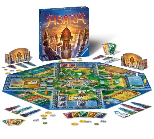 Ravensburger 26532, Famed designing duo Wolfgang Kramer and Michael Kiesling will have a new title out from German publisher Ravensburger in time for Spiel 2010: Asara which is subtitled Land of 1000 Towers .... Compete with your fellow players for the most beautiful towers. Players take on the roles of famous architects and using their chicanery, try to obtain the best construction parts. With these the exuberant towers are erected. Think ahead, use your tactical sense and it will help you to stay ahead of the other players and thereby becoming the greatest architect of the country. Exciting construction entertainment for the whole family.