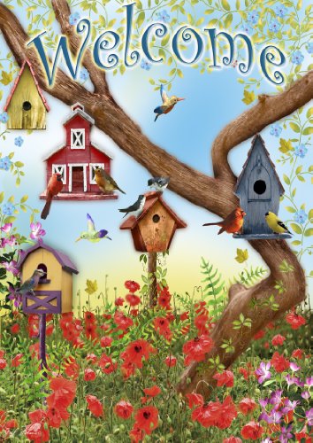 Toland Home Garden 102097, This Poppies and Birdhouses House Flag will make a statement hanging from your front porch or in your garden this season. This backyard scene features multiple birdhouses and birds all enjoying the nice Summer warmth, artwork by Gail Marie with a beautiful array of flowers in the foreground and bright blue skies in the back, topped off with a whinsical "Welcome" banner, let this flag fly high for all the birdlovers. From the authority in House and Garden Flags, Toland Home Garden only offers flags of the finest quality. There is something for everyone in Toland's sought-after line of original decorative art flags. Discover the wide range of seasonal, patriotic, holiday and renowned everyday flag designs. Find the right size flag for your home, almost all of the Toland Flag designs come in either a large house size or a smaller garden size. Also, don't forget your flag accessories like flag poles and flag arbors to display these beautiful decorative flags.